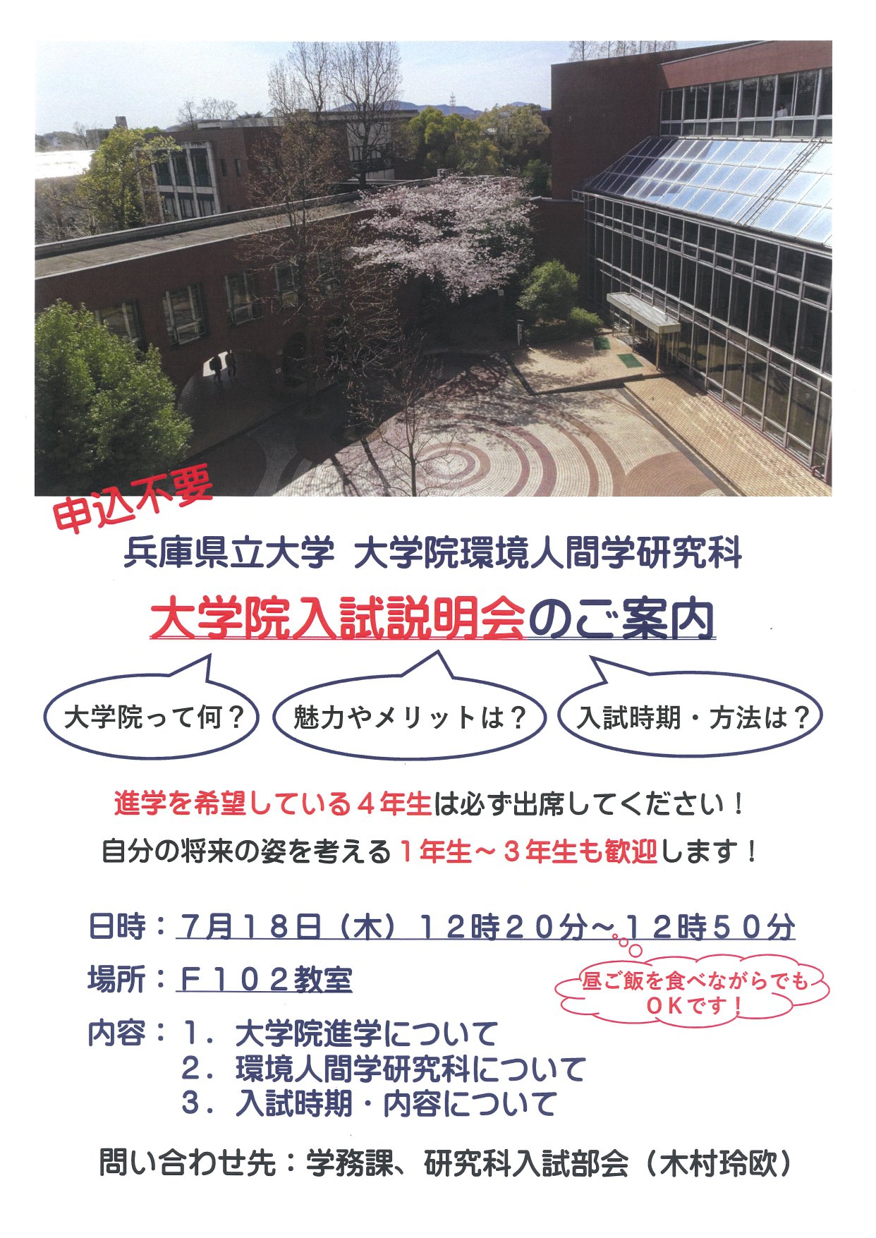 兵庫県立大学 広報チーム On Twitter 兵庫県立大学 大学院 環境人間学研究科 大学院 入試説明会 のお知らせ 7月18日 木 時間 12 20 12 50 場所 F102教室 大学院って何 魅力やメリットは 入試時期 方法などは 等の質問などお答えします 進学希望